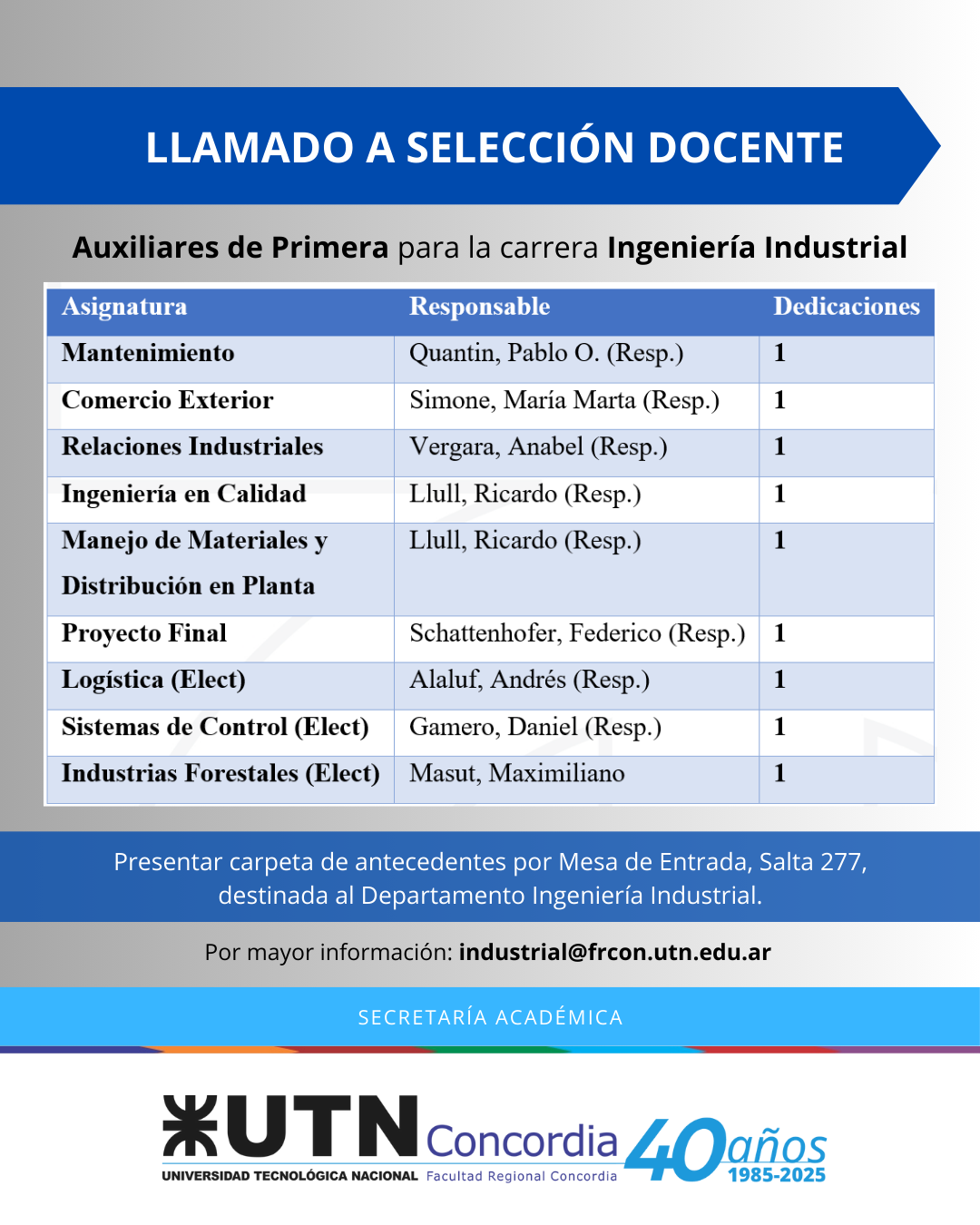Docente*, para la Carrera *Ingeniería Industrial* de nuestra Facultad, e